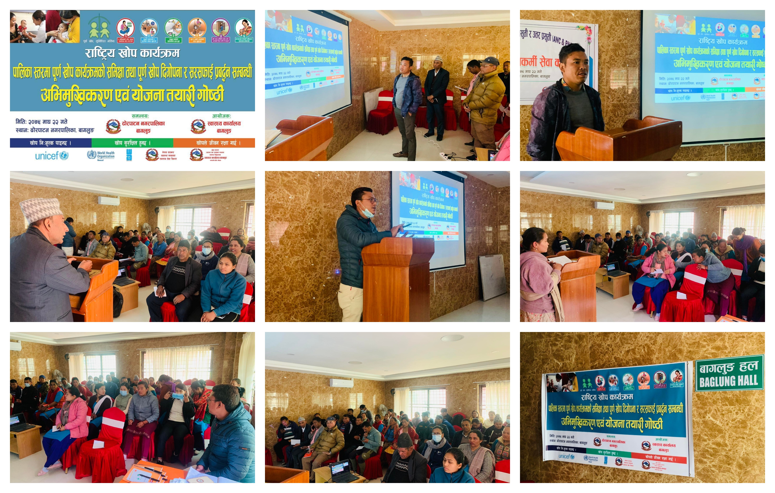 पालिकाका नगर उप प्रमुख श्री धन बहादुर कायत ज्यूको अध्यक्षता, प्रमुख प्रशासकीय अधिकृत श्री विष्णु प्रसाद ज्ञवाली ज्यूको विशिष्ट आतिथ्यतामा कार्यक्रम सम्पन्न भएको थियो । उक्त कार्यक्रम नगरपालिकाका स्वास्थ्य शाखा प्रमुख तथा जनस्वास्थ्य निरिक्षक श्री केशव थापाको स्वागत, स्वास्थ्य कार्यालय बागलुङका खोप सुपरभाइजर श्री राजु खत्रीको सहजिकरण र नगरपालिकाका पोषण तथा सरसफाई सहजकर्ता वेली कुमारी भुजेलको संचालनमा भएको थियो ।